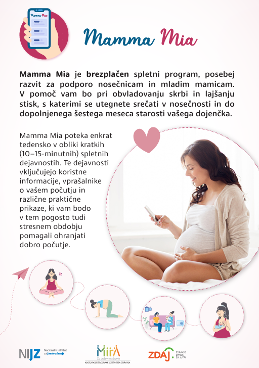 Prijavi se na Mamma Mio – brezplačen spletni program, ki je delo norveških strokovnjakov in spodbuja skrb zase, pomaga bolje razumeti vedenje vašega dojenčka, se povezati z njim, olajša prehod v novo življenjsko obdobje za oba partnerja in zmanjšuje tveganje za poporodno depresijo. Začne se v 21. tednu nosečnosti in zaključi 6 mesecev po porodu.